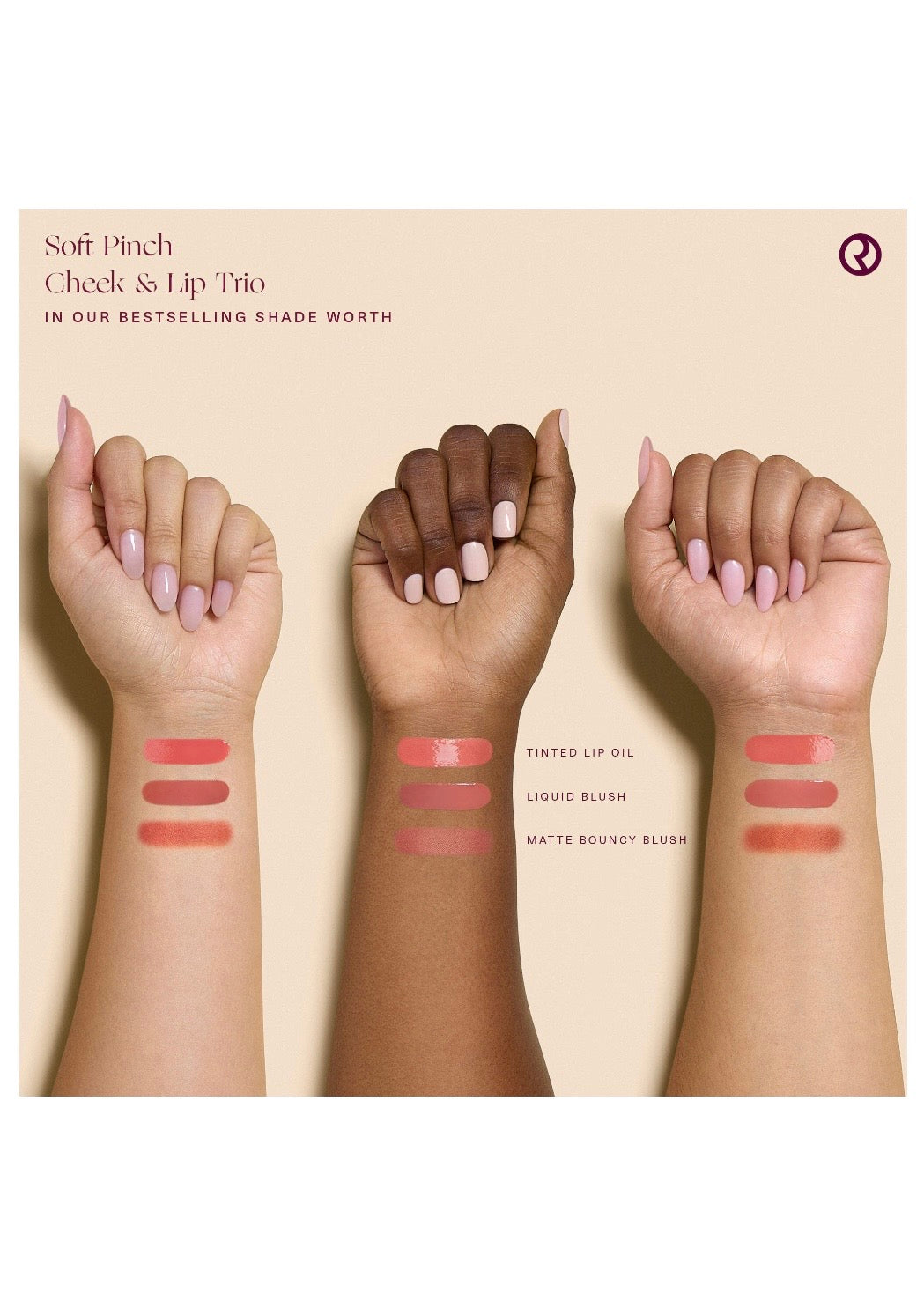 Qué es: Un conjunto de elementos esenciales Soft Pinch más vendidos con un colorete mate de tamaño completo, un mini colorete líquido y un mini aceite de labios teñido, todo en un tono favorido de los fans.
